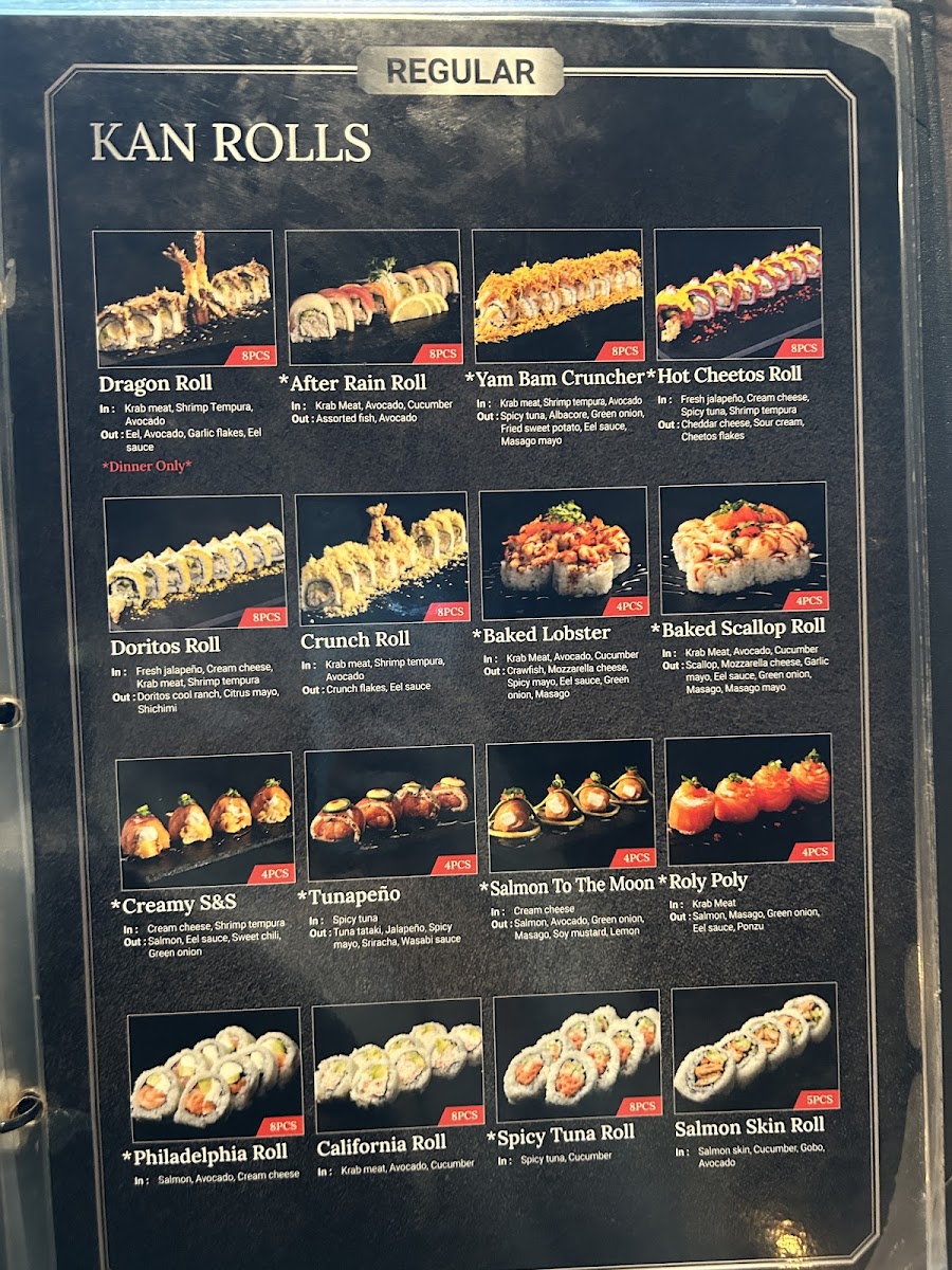 Kan Sushi specializes in fresh, made-to-order sushi and rolls that not only satisfy your cravings but also dazzle your taste buds. This isn’t just your run-of-the-mill sushi restaurant; it offers an all-you-can-eat buffet option meticulously crafted to ensure every bite is a reason to celebrate. Imagine sinking your teeth into their Hot Cheetos Roll – a tantalizing combination of shrimp tempura, creamy avocado, and rich cream cheese, all topped with a crunchy layer of crushed Hot Cheetos, spicy mayo, and wasabi mayo. Every bite bursts with flavor and texture that dances on your palate. If you prefer a classic touch, the Crunch Roll — filled with succulent crab meat and topped with crunchy flakes — promises a deliciously comforting experience.